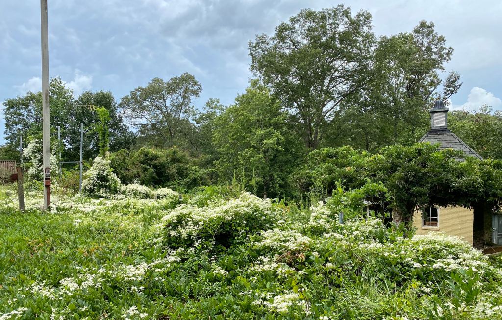 4. Considered an northeastern Asian invasive vine in some States, Clematis terniflora, or Autumn Clematis is stunning this year. It has a fragrance similar to honeysuckle. The first two photos below come from a patch I have growing controlled in the wooded area of the garden. The third photo is of an abandoned tennis court in a lot next to mine. It clearly shows how it can be considered an invasive!