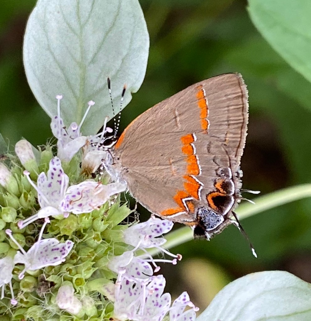 3. Now the favorite: Whiteleaf Mountain Mint or Pycnanthemum albescens. This tall herbaceous native has a very pleasant fragrance, and even though the flower heads are subtle, they are set off by a framing of the silvery white leaves. They are almost always covered with a variety of flying insects; this week I was able to capture photographs of two photogenic ones, a Bumble Bee and a Red-banded Hairstreak.