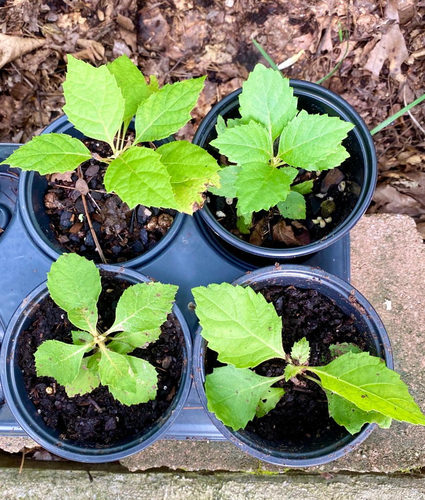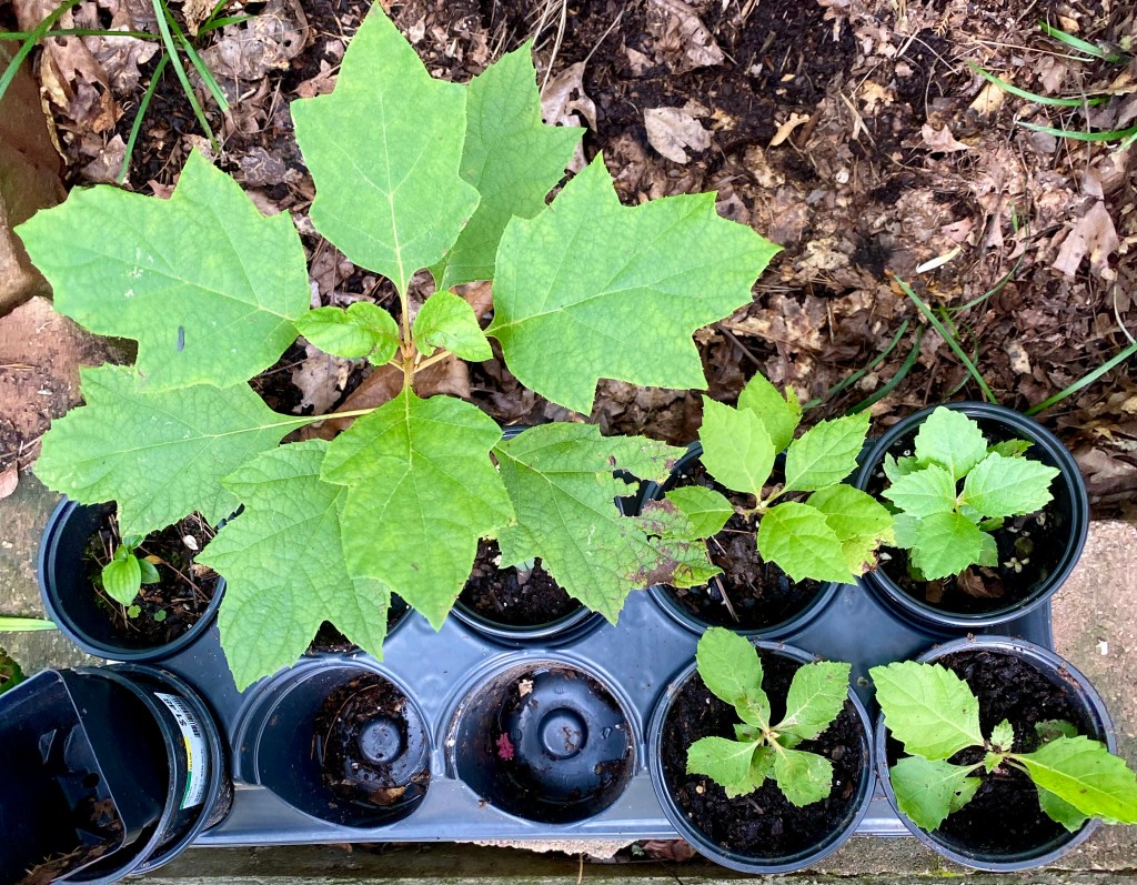 5. Oakleaf Hydrangea volunteers have appeared among the stones around my fire pit. As they have been getting big enough to transplant, I’ve been potting them. It won’t be too long before I can pass them on. The second photo below includes one I potted about a year ago. In it you can see the transformation of the young leaves toward the characteristic oak leaf shape.