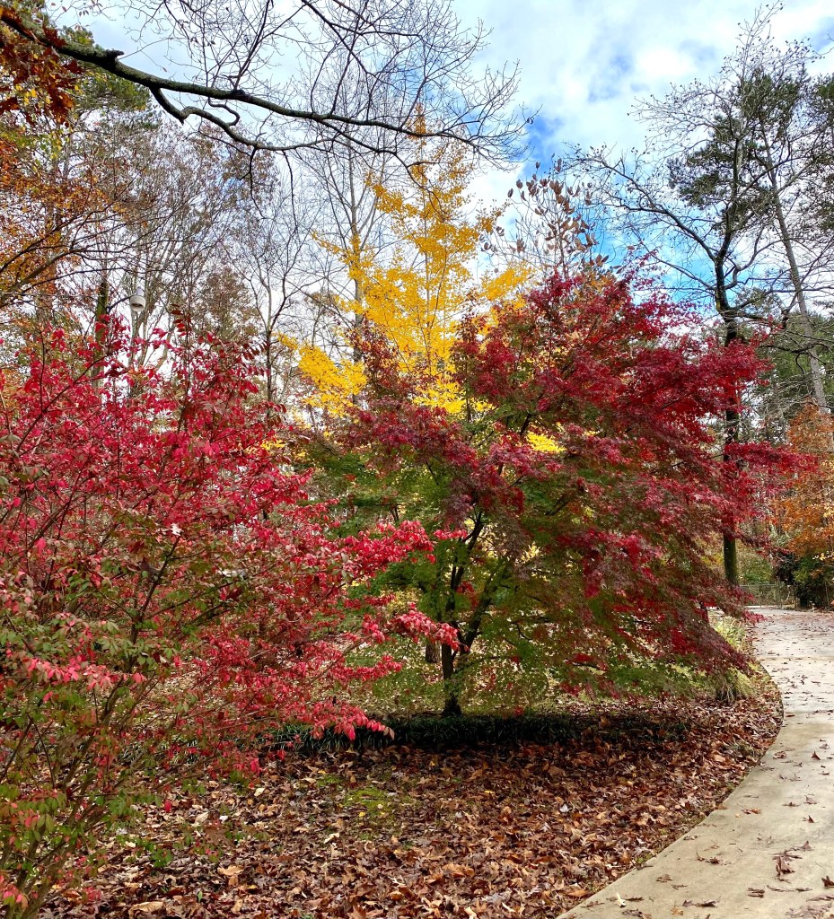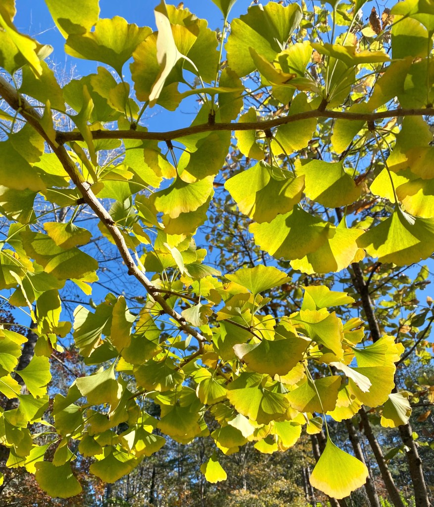 - This week’s six are straightforward–leaves. Red leaves and gold leaves. I’ll begin with the gold ones: Ginkgo leaves, as seen against the backdrop of a maple tree in the featured image. I adore this tree in part because it is a symbol of the small, private liberal arts college I taught at for 41 years (in fact my tree started as a seedling taken from one of the Birmingham-Southern College trees). But Ginkgo biloba is also an absolutely beautiful tree, besides being one of the oldest living trees, having been around for about 350 million years. It is often dubbed a “living fossil” on websites. Sometimes the leaves seem to go from green to gold almost overnight; most of the time they seem to drop all those leaves overnight as well. The first photo below gives some sense of how they change color from the end of their fanned edges toward the stem. The second photo shows the entire tree that has been growing for 25 plus years and has survived a tornado taking its top out in March 2008.