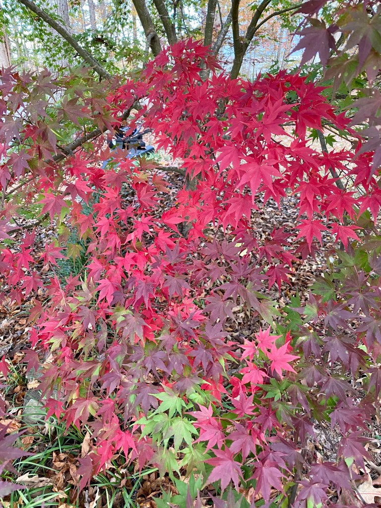 2. Below the ginkgo now serves as backdrop for a Japanese maple and the Euonymus alatus, or burning bush, I mentioned in a post last month. What I am focusing on is the Acer palmatum, which puts out variegated leaves in the spring, stays a bright green in the summer, and turns a stunning crimson in the fall.