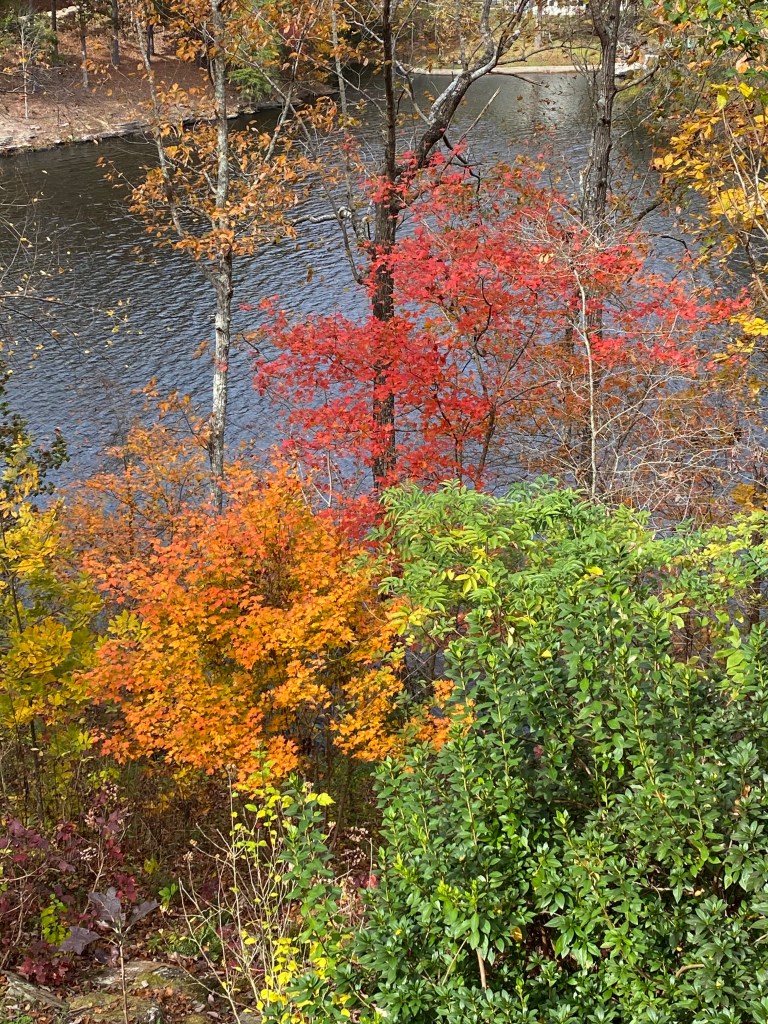 5. A group of trees and a range of colors come in next. This photo obviously pictures the hill that slopes down to the lake behind the house. The red and orange comes primarily from maples. The green shrubs the foreground are an elderberry, an azalea, and a scraggly althea, or Rose of Sharon.