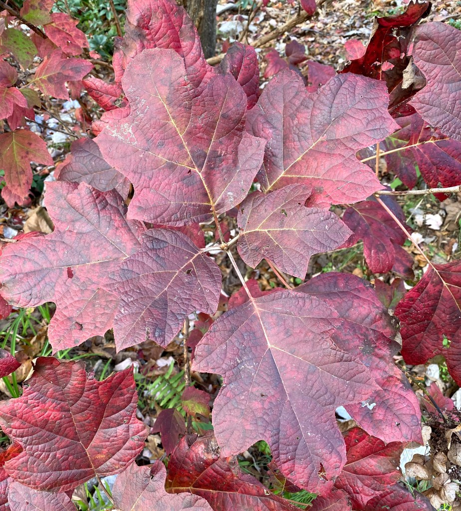 3. The Oakleaf hydrangeas also sport crimson leaves at the moment. The remaining flowers, however, have dried to a papery-brown. I like them. I like the tiny seeds, their contrast with the large leaves.