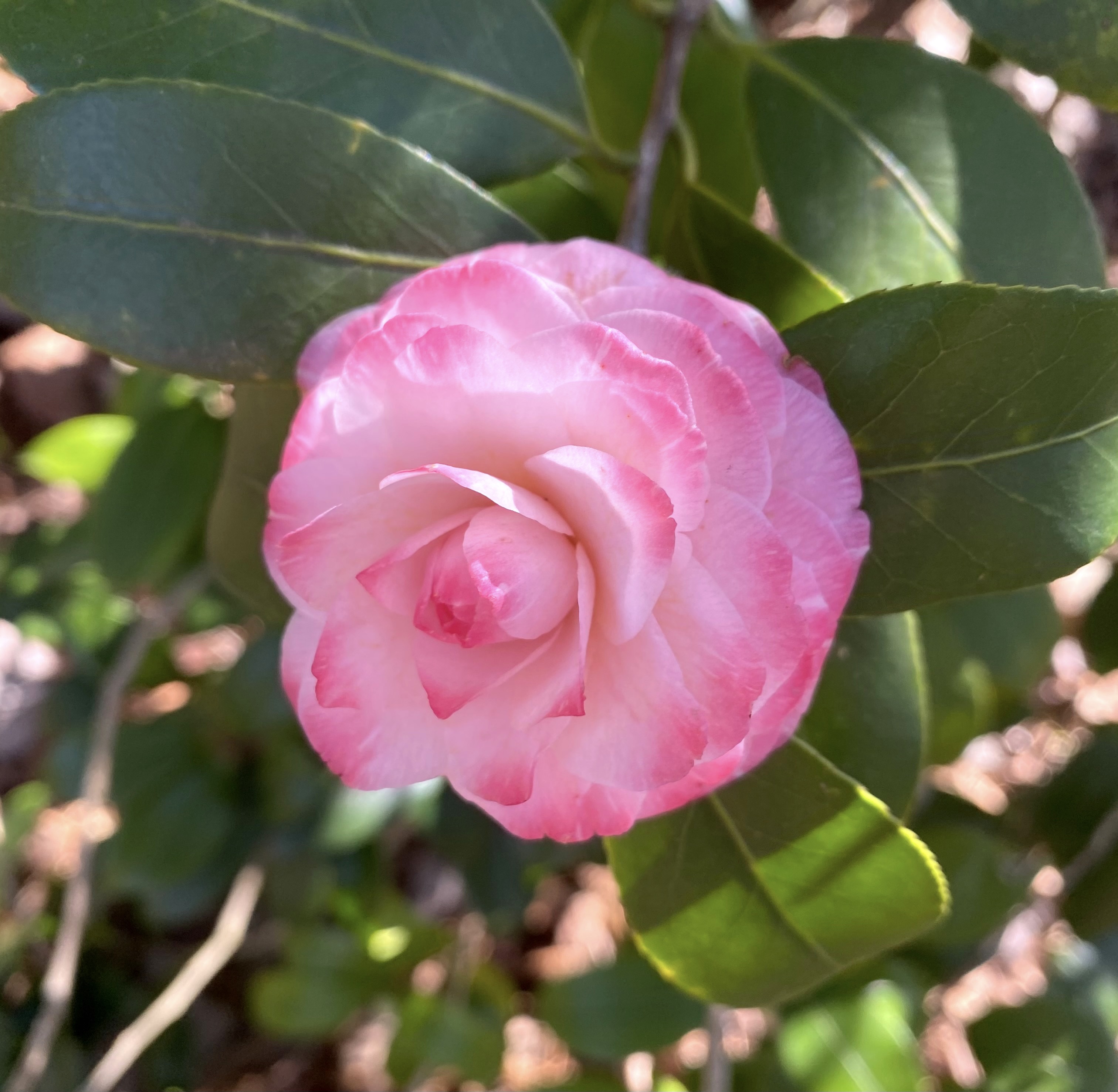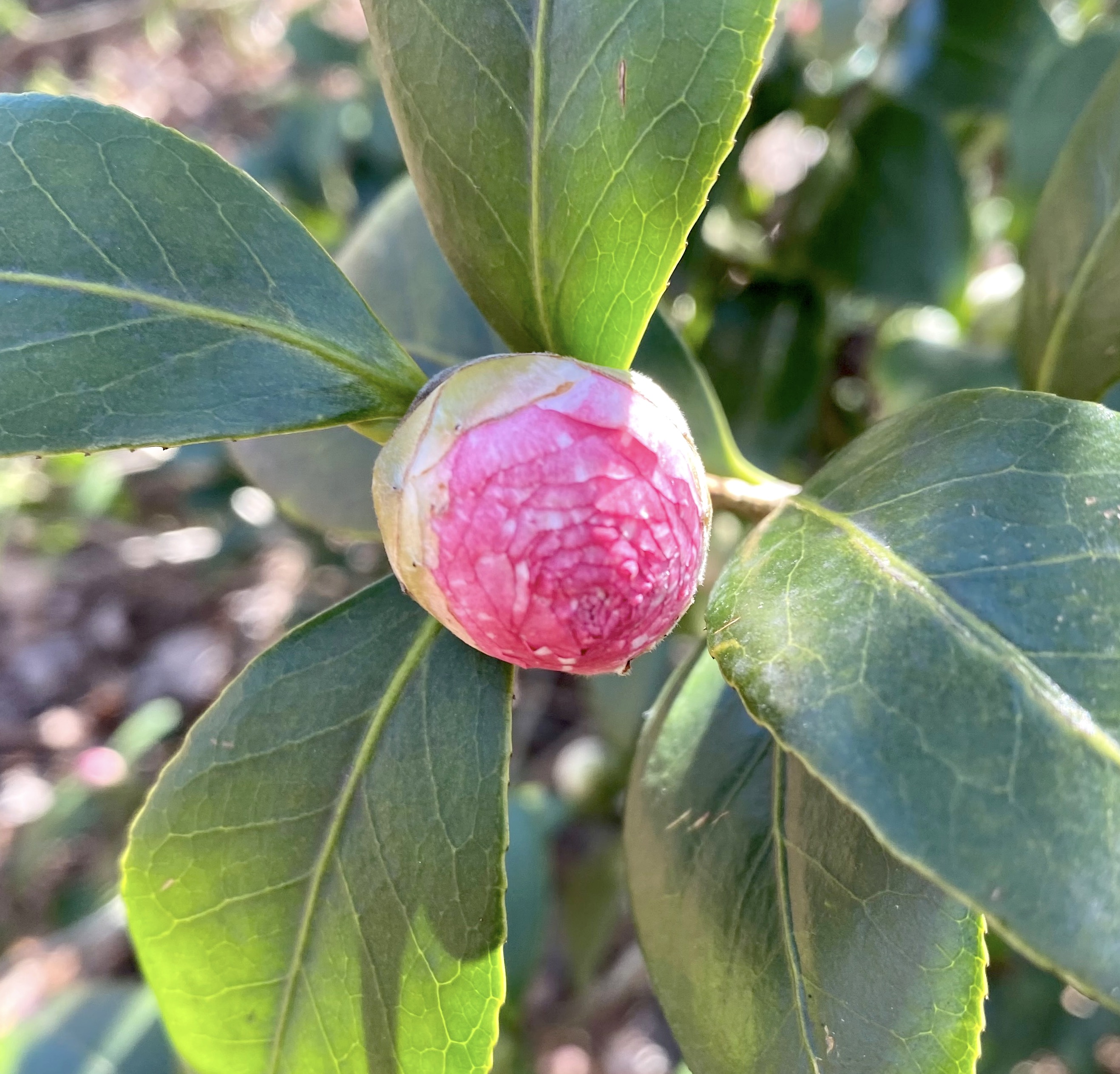 1. Now back to the featured image of Camellia japonica Grace Albritton. The first buds that came out a few weeks ago were quickly frost burned or frozen. What you see below has developed just within the past week. The lovely thing about this shrub is the way the bud opens from a tightly furled deep pink globe to a very light pink flower edged with the darker shade.