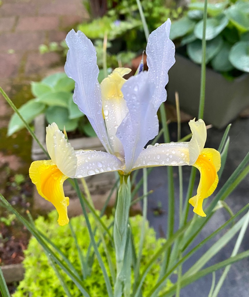 5. In the fall, I planted some Dutch iris bulbs among stonecrop in a concrete planter on a little patio wall outside the front door. This is the first of them to bloom, but it looks as though a few more will soon. I’m please to see any of them at all because all winter I had to fill in squirrel diggings in the stonecrop. These photos were taken early in the morning before dew dried on the falls and standards.
