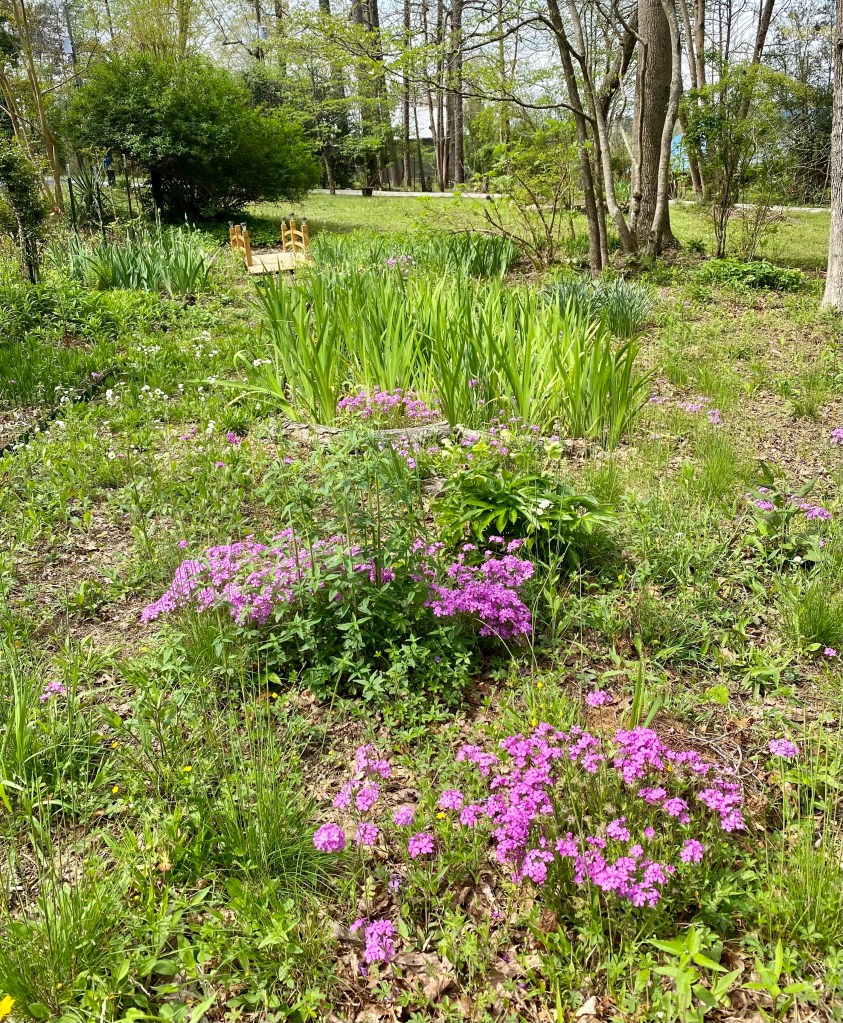 2. The downy phlox deserves its own entry. Here it blooms with accompanying hellebores and the small, white-flowered native flea bane. And, as you can see another grouping of irises is working toward its show time.