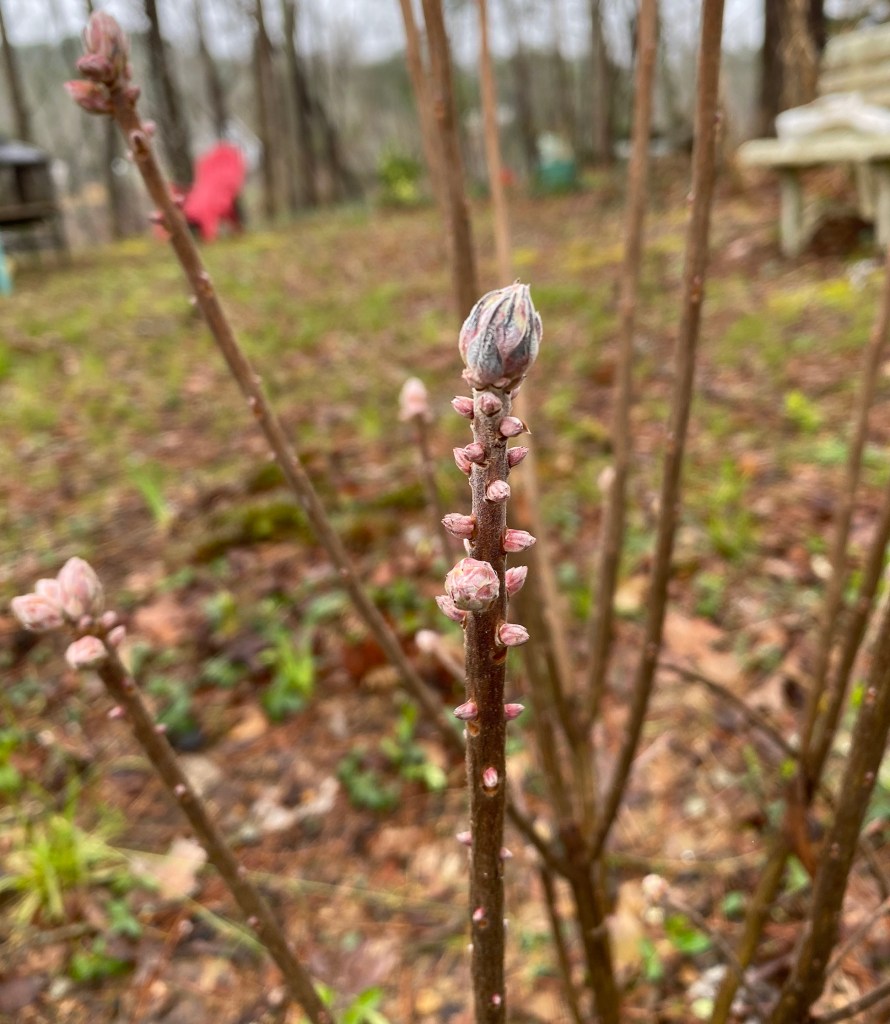 5 and 6. Two native azaleas compose the final two entries. The first below, Rhododendron alabamense, typically blooms in April with white flowers touched with yellow on one petal. I am certain to feature it in full bloom later in the spring. For now, the buds are promising after my concern that the azalea might be in decline last year. The second, Rhododendron canescens ‘Camilla’s Blush’ was given to me last fall. The tag says, “Light pink, fragrant blooms.” I hope the tag proves true.