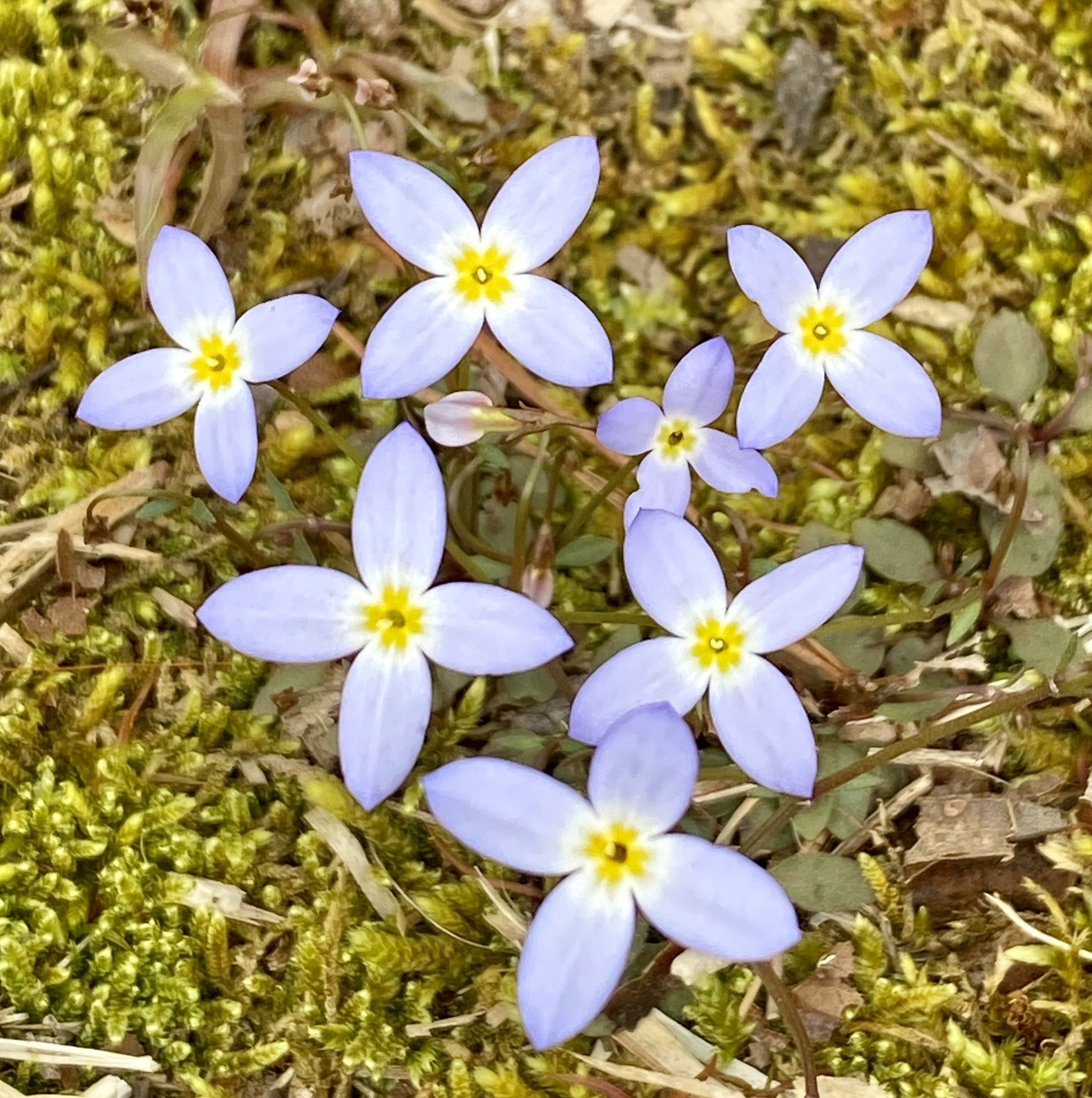 1. Bluets, or Quaker ladies or azure bluets (Houstonia caerulea), start the list. A North American native, these delicate little wildflowers are numerous in patches around sunnier, open areas of the garden this year–far more numerous than last year. The first photo below shows the profusion, the second, taken a few weeks ago as bluets were just beginning to appear, gives a better sense of their delicacy and color.