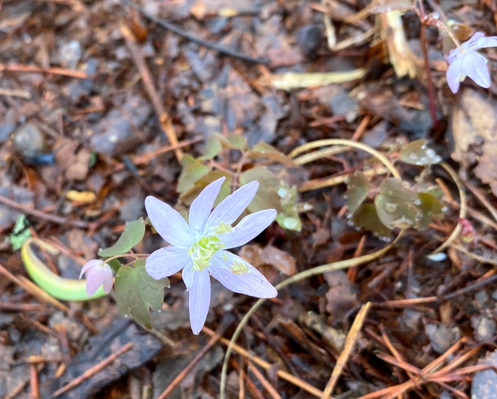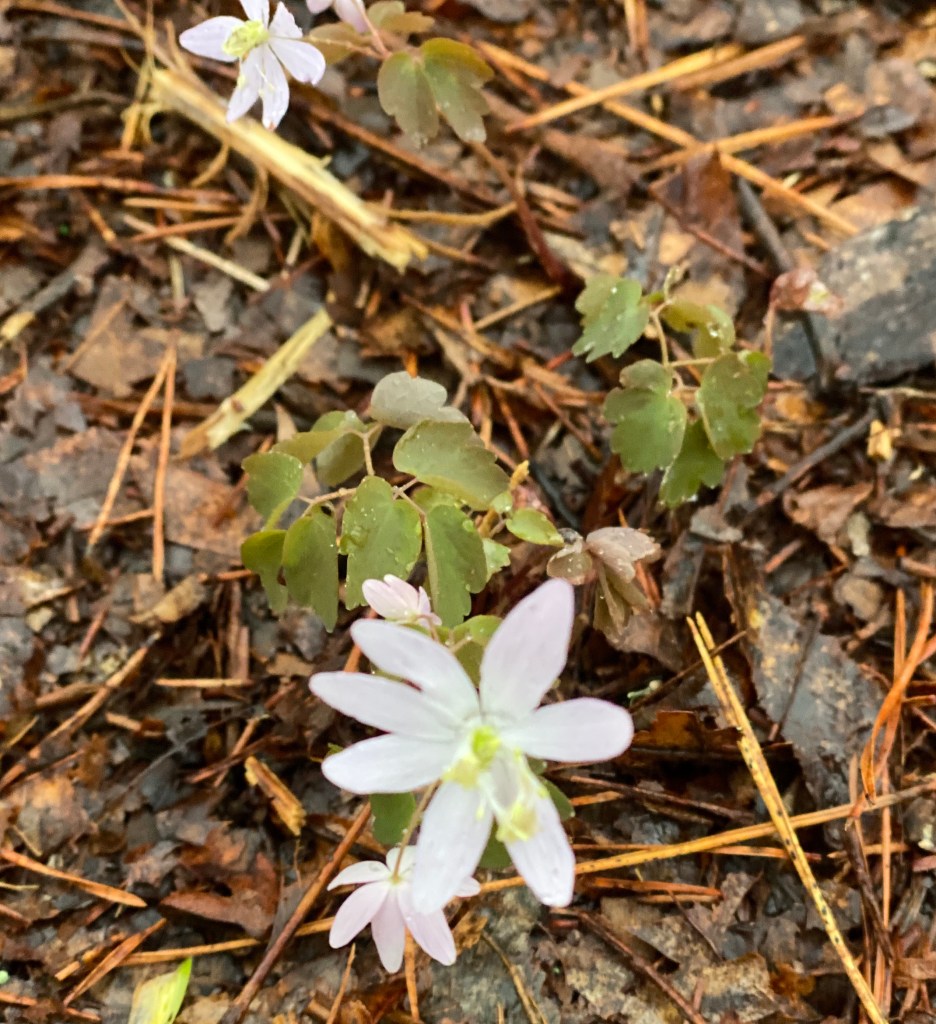 2. Another woodland perennial, rue anemone (Thalictrum thalictroides), is beginning to appear, but contrary to the bluets, these seem fewer in number this year. Maybe it is just too early for these spring ephemerals; maybe they are a victim of our recent see-saw weather. The first and third photos more accurately capture the pink tinged color of the petals; the first captures the nearly every-other-day rain as well.