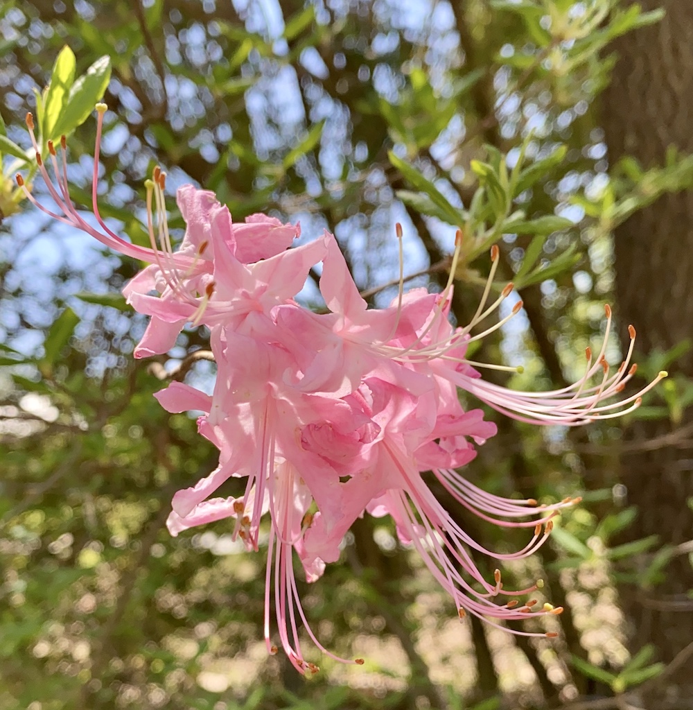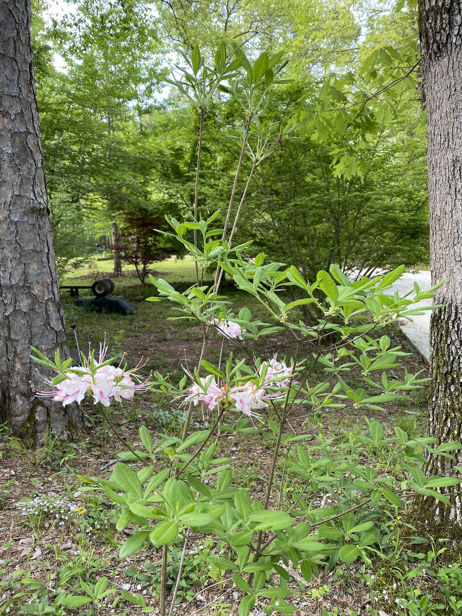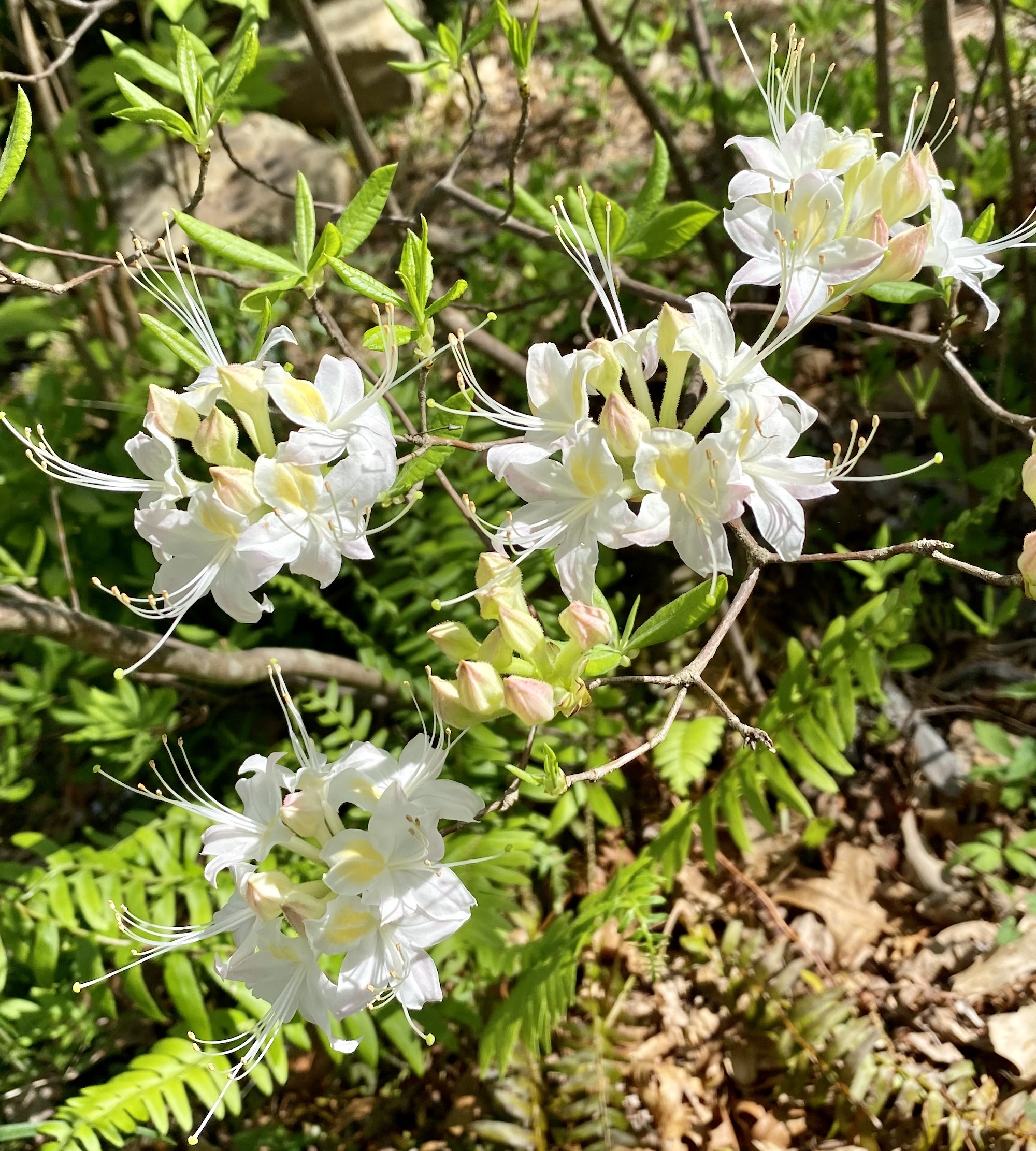 5. The fifth entry for today relates to the featured image–native Alabamas azaleas. The star of the show is the white Alabama azalea (Rhododendron alabamense). The closeup photo on the bottom left shows the identifying yellow blotch on one petals of each flower. Besides being lush with blooms, this azalea is wonderfully fragrant this season. The second is one of the other common natives in this area, the Piedmont or mountain azalea (Rhododendron canescens). It has bloomed briefly and sparsely this spring. The photo in the center on the bottom is of one of the earliest flowers a month ago. The final native is a new one for me, a Rhododendron canescens cultivar, ‘Camilla’s Blush.’ Its light pink color is reminiscent of the Piedmont azalea, but it flowers quite differently along the branches.