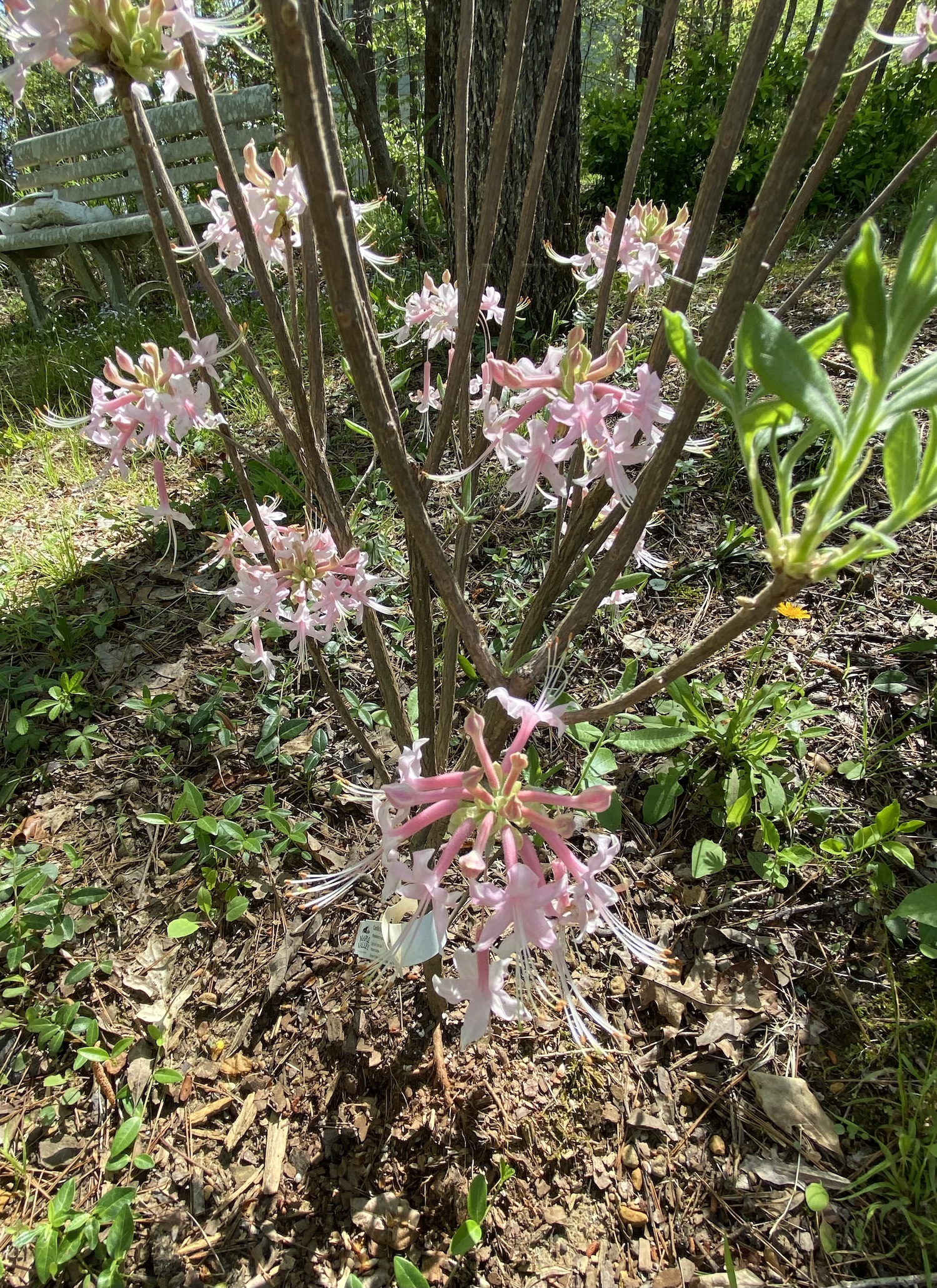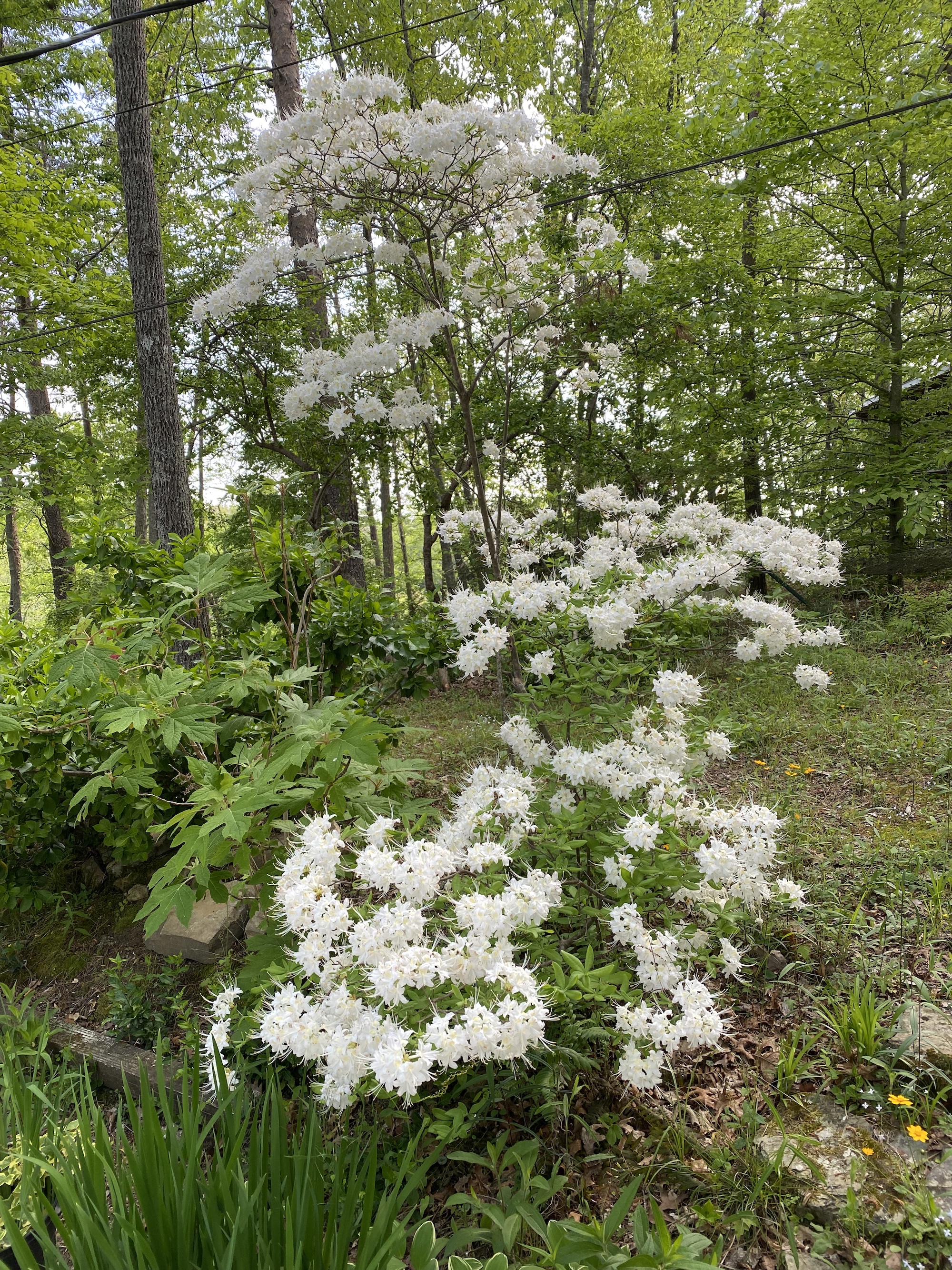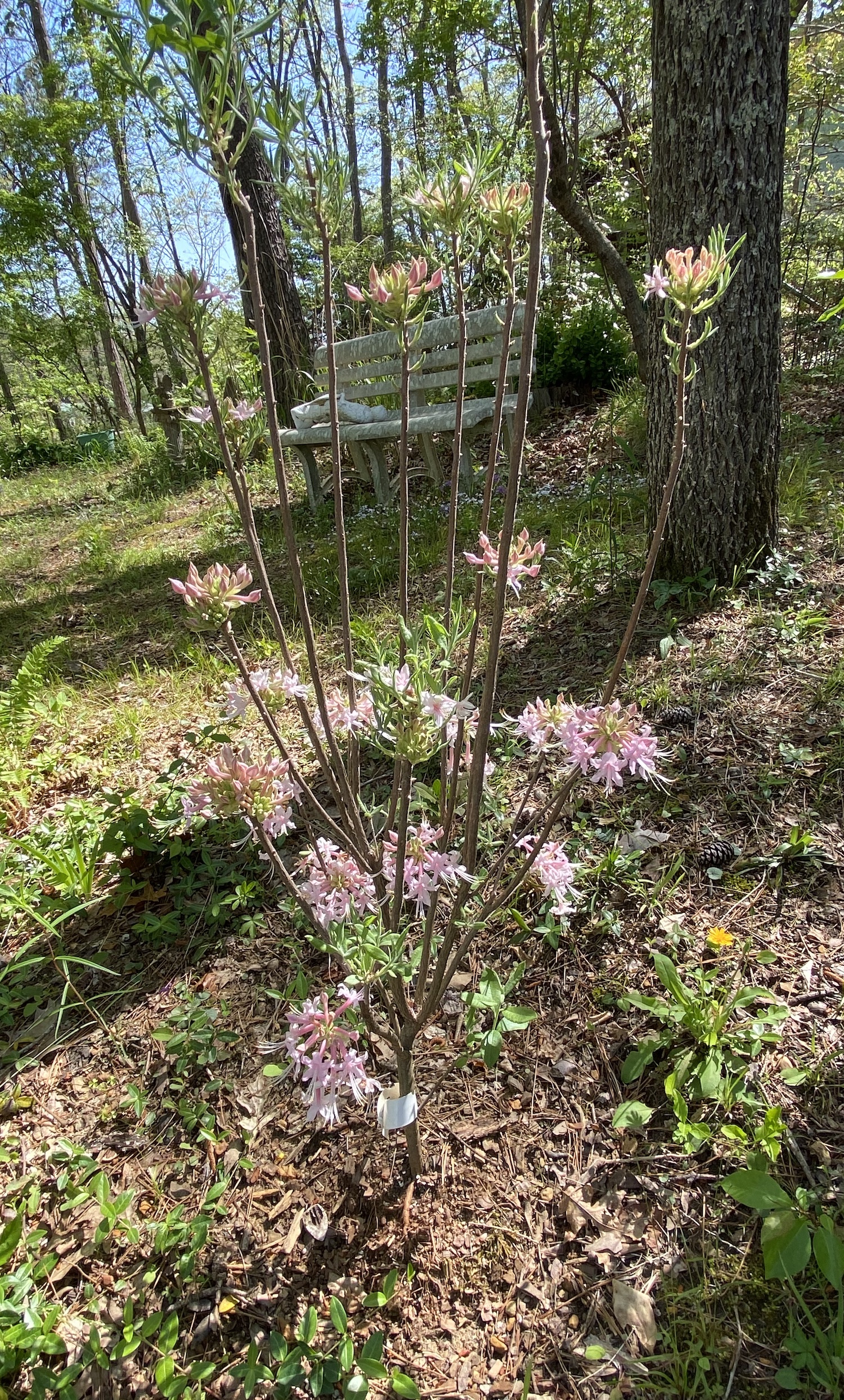 5. The fifth entry for today relates to the featured image–native Alabamas azaleas. The star of the show is the white Alabama azalea (Rhododendron alabamense). The closeup photo on the bottom left shows the identifying yellow blotch on one petals of each flower. Besides being lush with blooms, this azalea is wonderfully fragrant this season. The second is one of the other common natives in this area, the Piedmont or mountain azalea (Rhododendron canescens). It has bloomed briefly and sparsely this spring. The photo in the center on the bottom is of one of the earliest flowers a month ago. The final native is a new one for me, a Rhododendron canescens cultivar, ‘Camilla’s Blush.’ Its light pink color is reminiscent of the Piedmont azalea, but it flowers quite differently along the branches.