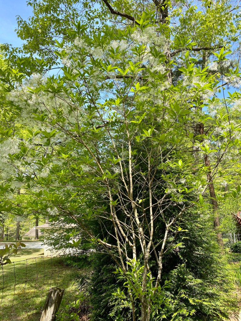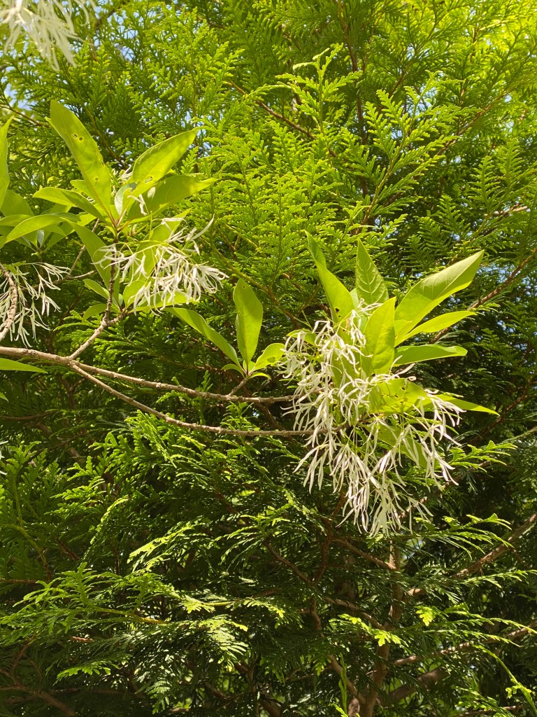 6. I’ll end with a deciduous tree that is fabulous this time of year and rather pedestrian the rest of the time–if not dull in winter. The native grancy graybeard or fringe tree (Chionanthus virginicus) blooms in these tassel-like flowers, which wave gracefully in the breeze.