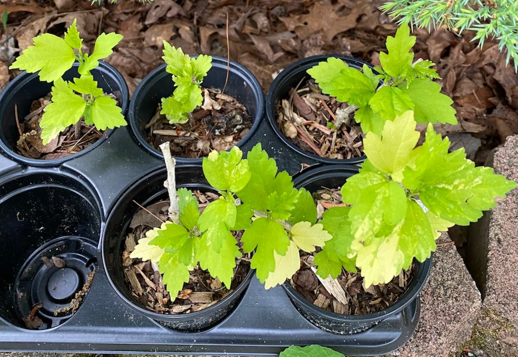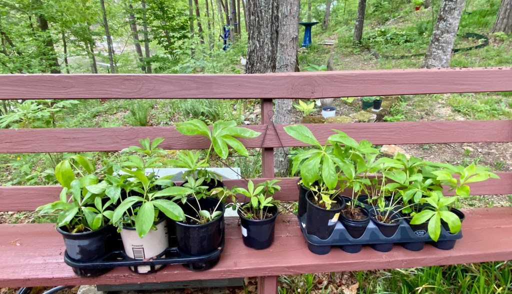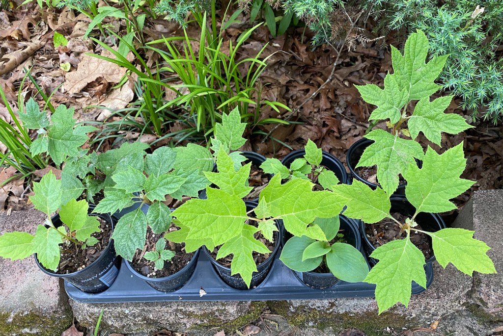 3. While on the “potted up” topic, I have a progress report on some oakleaf hydrangea volunteers I transplanted last spring. These are for gifts, rather than for sale. For some fortunate reason, this acre on Straight Mountain seems like an oakleaf hydrangea nursery, and I have several friends that appreciate one of these “babies” to raise in their own gardens. I’m not sure when I added the tiny hosta to the tray below, but I’m pleased to see it come up looking good this spring.
