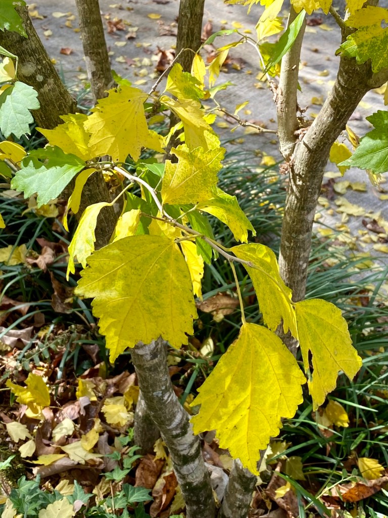 Last week I noted that there is little flowering in the garden right now. And such is still the case. I also noted that while the leaves are changing, they are struggling to take on vibrant autumn colors. And such is still the case. Nonetheless, I was able to pull together six photos of leaves with proud color ranging from lemon-yellow to butterscotch to red to bronze. I’ll just present them in a gallery below.