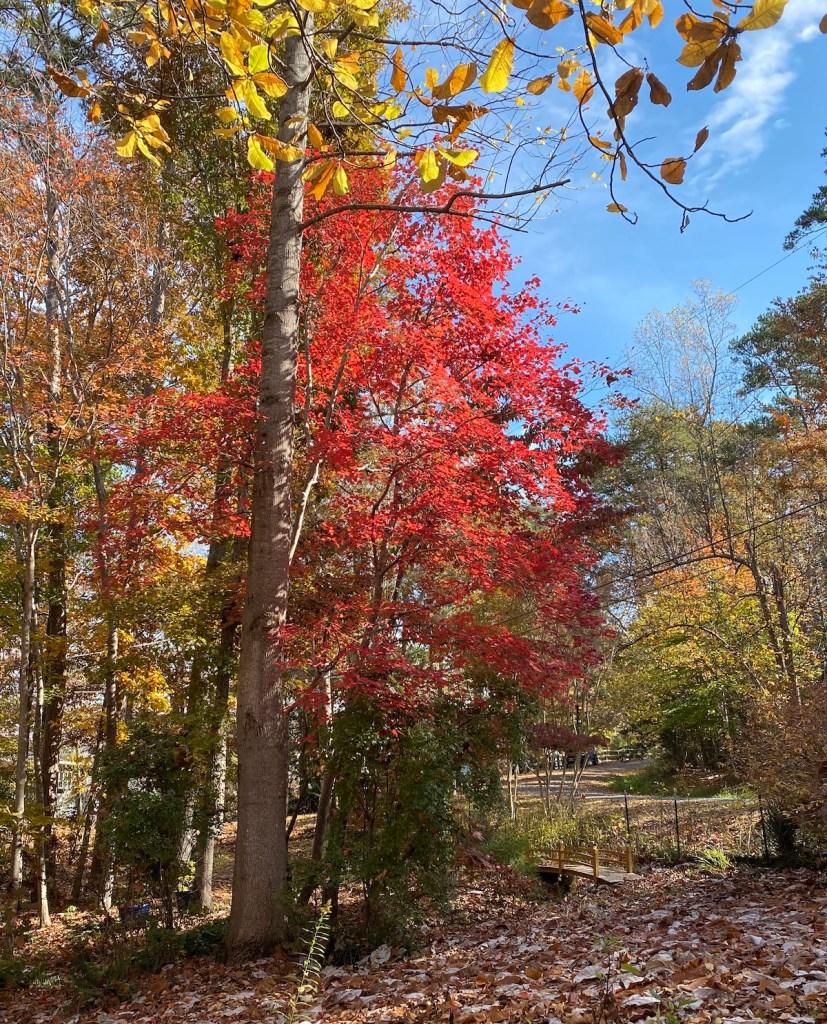 The sassafras is native, as is the oakleaf hydrangea; in fact, it is the Alabama State woodland shrub. The maple is likely native–it was certainly already in place when I purchased the lot, which had never been built on or developed. So, it might be a Chalk Maple, or Acer leucoderme. But that is not a tall tree. The other option would be a Red Maple (Acer rubrum). Regardless, it is one of several striking maples surrounding the house here at Highland Lake.