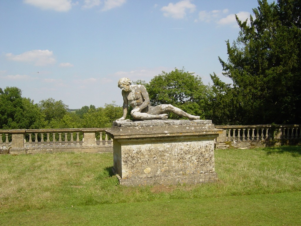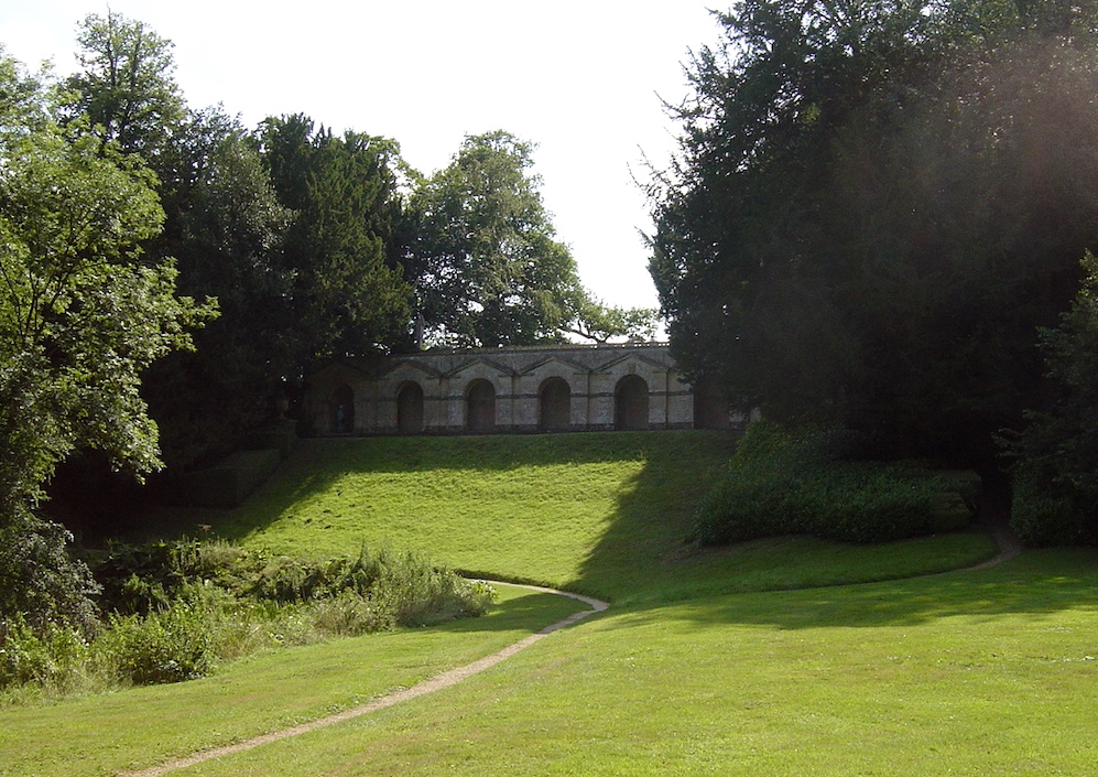 English landscape garden ethos is not all open space, however. Meandering walks opening on thought provoking statuary and beautiful vistas are essential. For example, see the figure of the Dying Gladiator and the paths surrounding the Arcade and the Temple of Echo below.