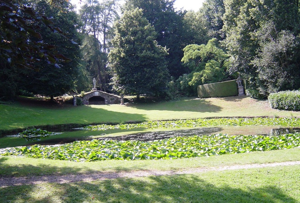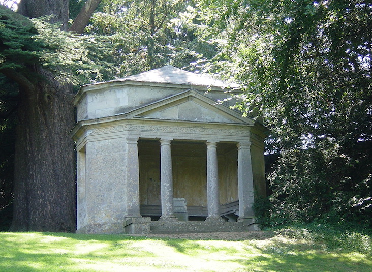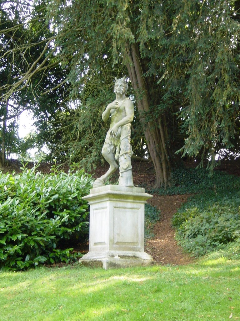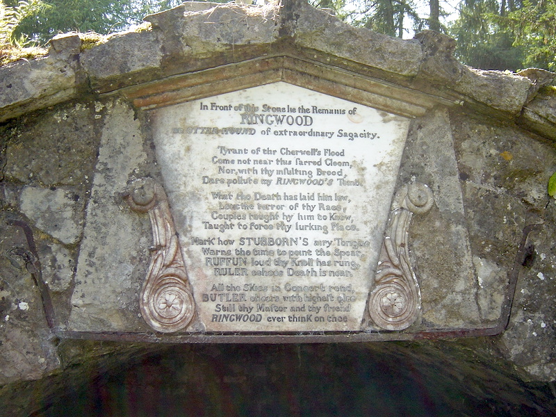 Maybe the most picturesque of the vistas in the garden is Venus’s Vale. Venus stands atop the Upper Cascade. Pan can be seen to the right in the photo. Below the pond, a second, or Lower Cascade continues the gently sloping landscape. I find the most appealing element in Venus’s glade, however, to be the memorial plaque to Ringwood the dog installed below Venus in the center of the Upper Cascade. It reads in part: ”In Front of this Stone lie the Remains of Ringwood an otter-hound of extraordinary Sagacity.” Apparently, Ringwood was so much the bane of otters and the superior of the estate’s otter hounds that “Still thy Master and thy friend RINGWOOD ever think[s] on thee.”
