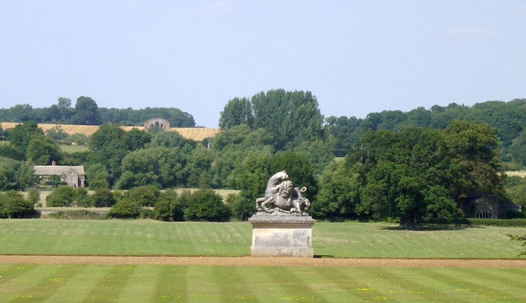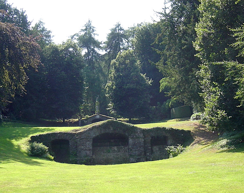 Here are some of those key features to look for at Rousham. First, is the Bowling Green leading from the house past the statue of The Lion and the Horse to the “eye-catcher” or “folly” near the horizon line in the distance. Look about 10 o’clock from the statue in the second photo below. The gray stone structure that looks like the ruins of a medieval castle is really just a wall worthy of a movie backlot set. It draws the eye beyond the boundaries of the garden into what Capability Brown referred to as borrowed landscape. It also typifies desire for the picturesque.