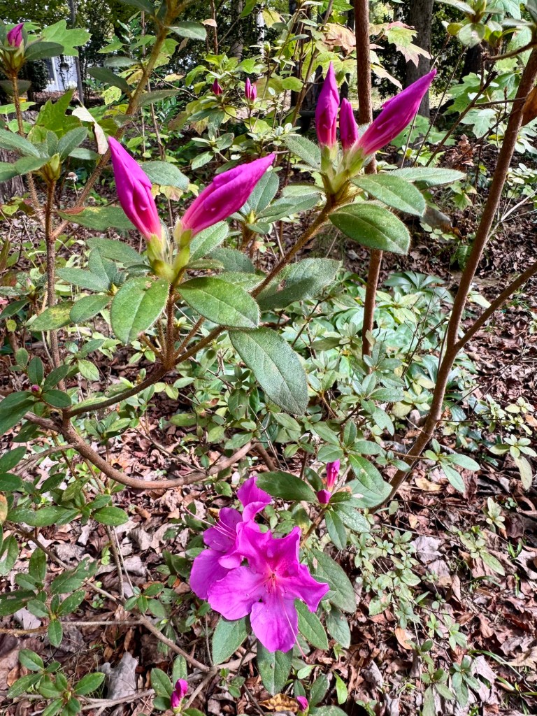 3 & 4. The Azalea on the left below (Rhododendron indicum) is in its second bloom this year–after a disappointedly spotty spring show. The little Chrysanthemum pictured next is at least seven years old. And, it is little, supporting merely a few twig-like stems. Still it perseveres and produces a few flowers every fall, even if it does have to fight through falling leaves. It is not a pretty plant ten months out of the year, but it deserves its place in this dry garden plot.