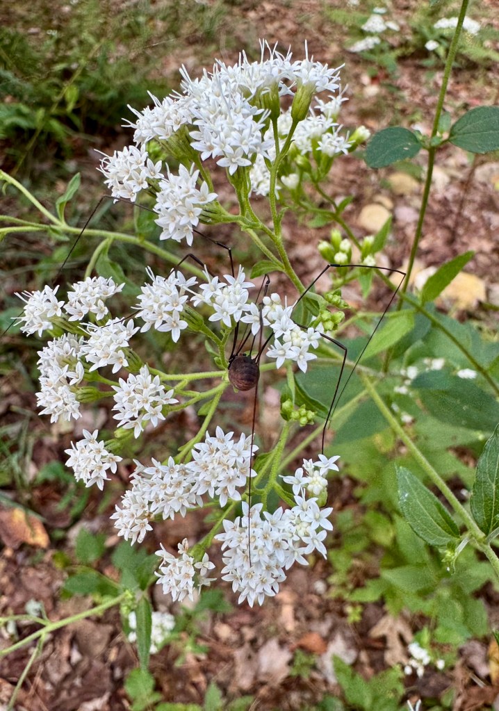 5 & 6. Two native plants round out the six for this week. Both have freely appeared in the garden, the first, White Snakeroot (Ageratina altissima) more plentiful than the second, Bottle Gentian. Notice the long-legged spider hiding in the White Snakeroot. Both are welcomed late summer or fall bloomers.