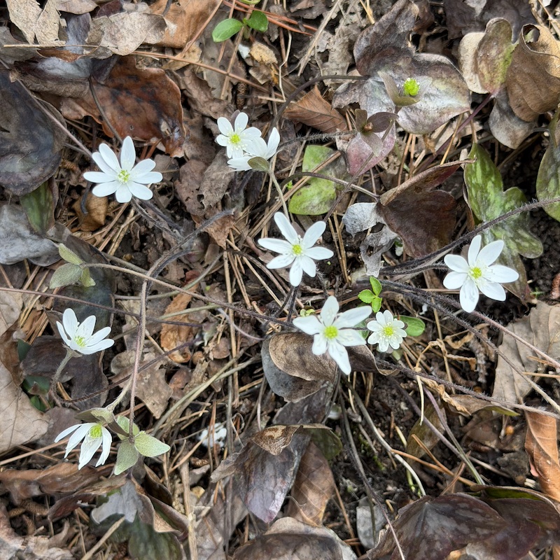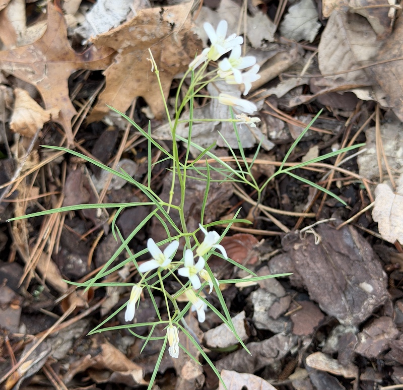 With the possible exception of Fork-leaf Toothwort, I’ve featured all of these wildflowers before. After all, they are my March flowering plants. Both Alabama snow wreath (Neviusia alabamensis) and false garlic, also known as crow poison (Nothoscordum bivalve) got some detailed attention 30 March 2024. Blood Root (Sanguinaria canadensis ), Rue Anemone (Thalictrum thalictroides ), and Sharp-lobed Hepatica (Hepatica acutiloba) got their special attention on 16 March 2024. While I posted information about Cut-leaved Toothwort (Cardamine concatenata ), in March 2024, I don’t think I ever discussed Fork-leaf Toothwort (Cardamine dissecta). So, here is a little information on it. Like all the others, it is native, perennial, and a spring ephemeral. Most likely I either overlooked it in the past or mistook it for something else before it bloomed. Toothwort in the common name comes from little projections on the edible rhizomes, which are reported to be rather peppery tasting.